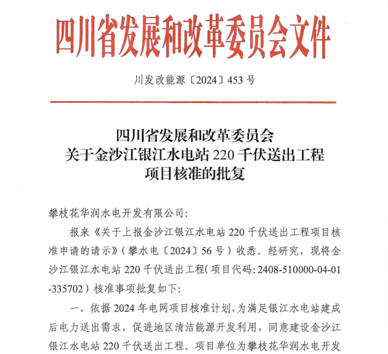 ¡¾ÅÊË®µç¹«Ë¾¡¿Òø½­Ë®µçÕ¾220ǧ·üËͳö¹¤³Ìϲ»ñÅú×¼