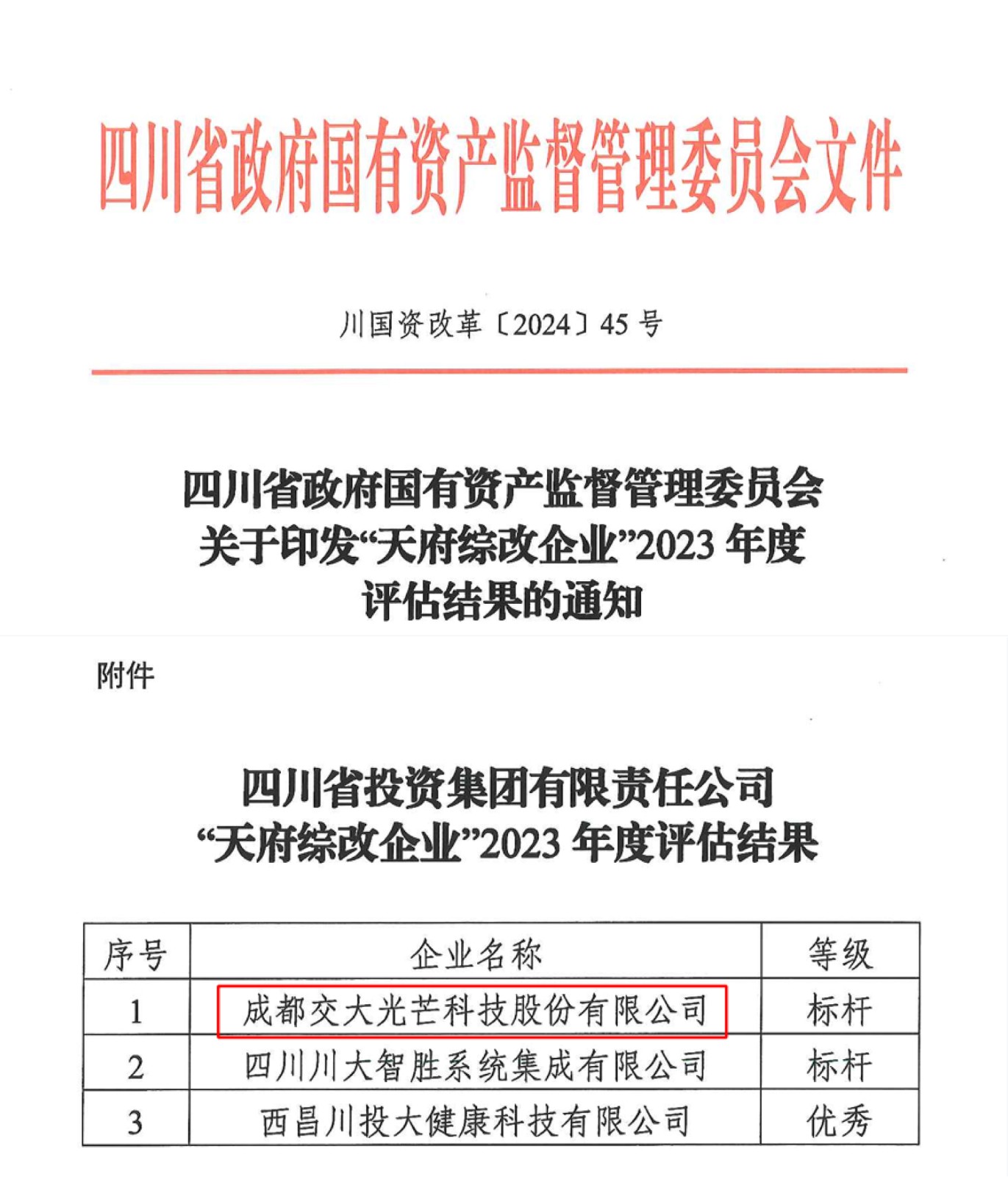 克日,四川省国资委印发“天府综改企业”2023年度评估效果,交大光线被评为A级(标杆)。此次评估由省国资委约请自力第三方机构举行,97户“天府综改企业”中被评为A级(标杆)的共22户。